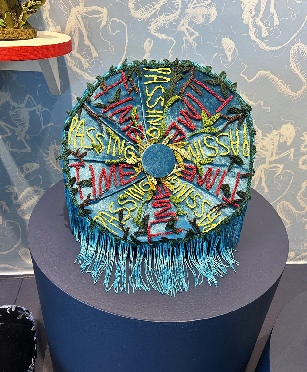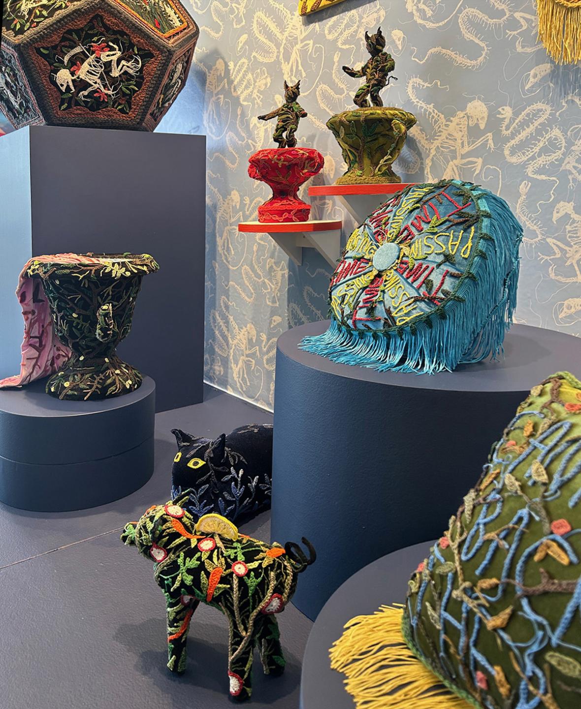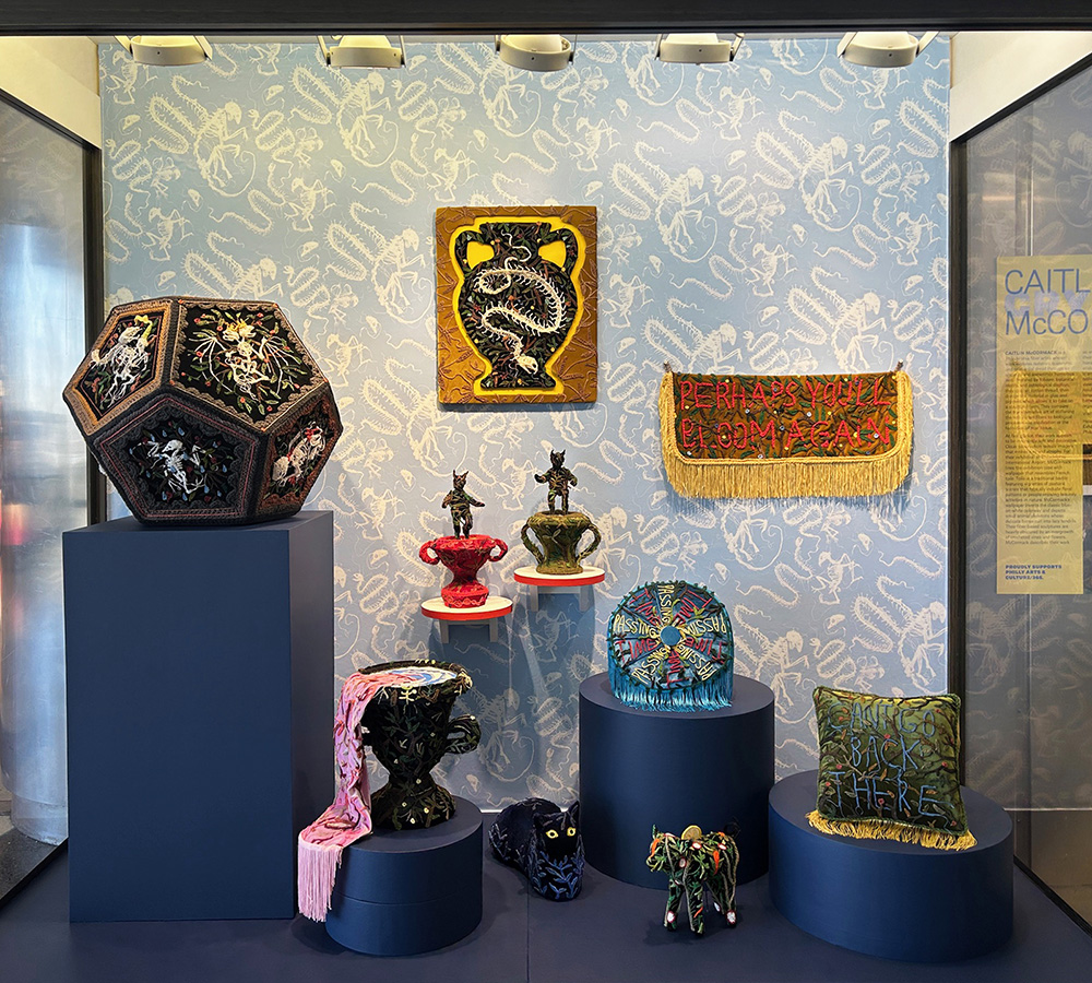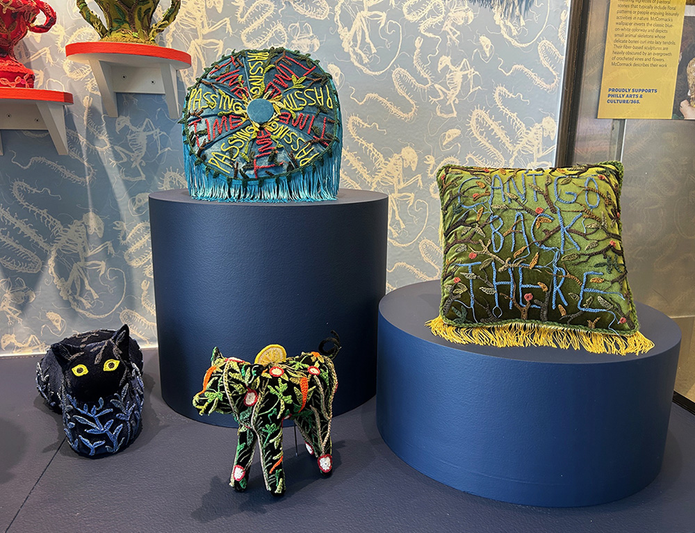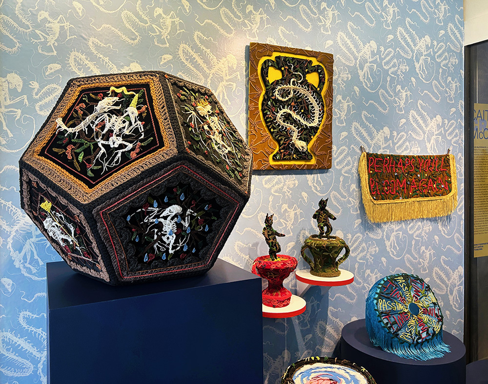 At first glance, their work appears to be innocently soft and decorative. Closer observation reveals imagery that evokes loss and atrophy. For their exhibition at Philadelphia International Airport, McCormack lines the exhibition case with wallpaper that resembles French toile. Toile is a traditional textile featuring vignettes of pastoral scenes that typically include floral patterns or people enjoying leisurely activities in nature. McCormack’s wallpaper inverts the classic blue-on-white colorway and depicts small animal skeletons whose delicate bones curl into lacy tendrils. Their fiber-based sculptures are heavily obscured by an overgrowth of crocheted vines and flowers. McCormack describes their work as an external representation of their inner thoughts surrounding hierarchy, craft, trauma and ecology. They write, “Each object is an unraveling relic of a thought, tethered to a surface and made viewable at a distance.” The resulting artworks reflect upon the tenacity of life and the relationship between artifacts and living, organic forms.