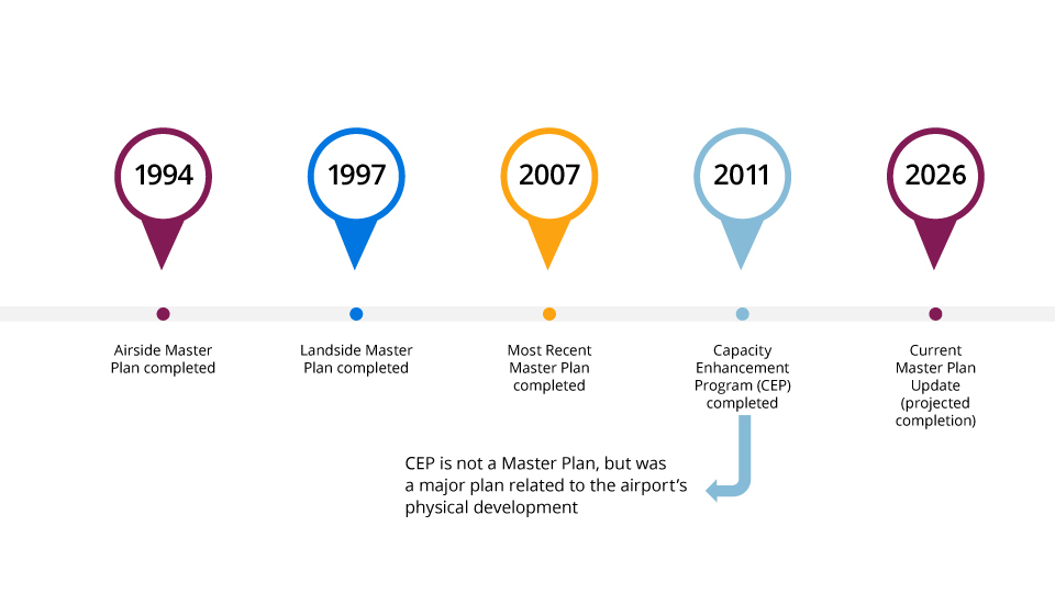 Philadelphia International Airport's (PHL) Master Plan Update is a strategic framework, carefully being developed through stakeholder engagement, technical analysis, and design which provides clear guidance on airport operations and future development. Plan implementation will support improved customer experience, optimize land use, expand economic opportunities for the region, and promote environmental stewardship, efficiency, and safety. The overall plan needs to be affordable, with an implementable plan that is incremental. PHL’s previous Master Plan was developed in 2007 with a major update in 2011 as part of the Capacity Enhancement Program. Typically, the Airport aims to update the Master Plan every 10 years to realign goals and objectives with projections and current trends.