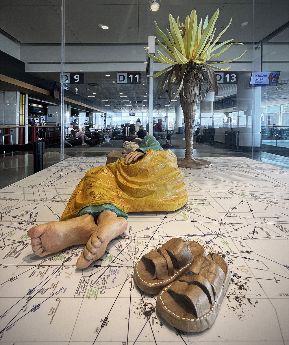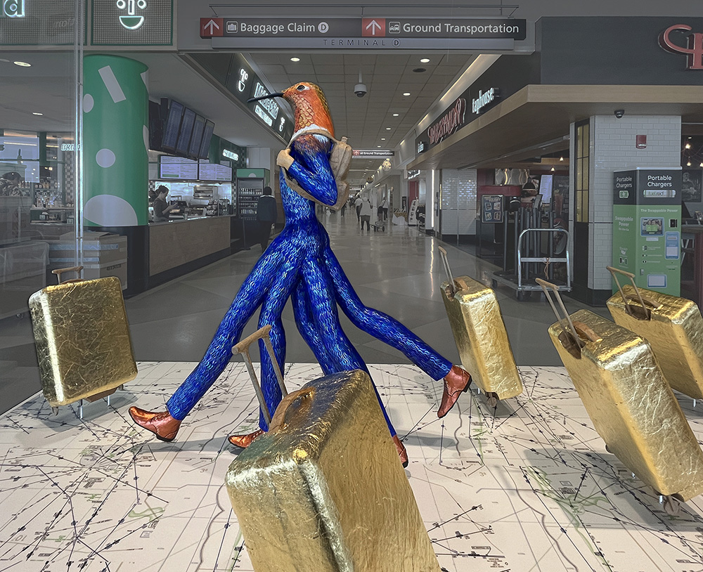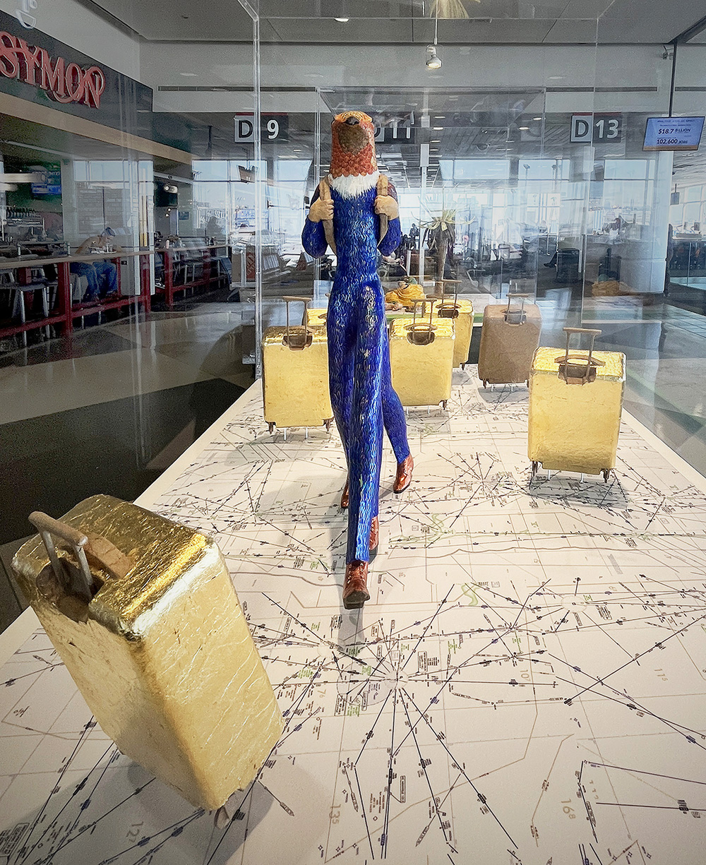 Mauricio is heavily inspired by the Mexican Surrealism movement and traditional Latin American aesthetics. Paper maché, also known as cartonería (Spanish for cardboard), is an ancient craft with the earliest recorded pieces dating back to the year 202 B.C. Like many Latin American customs, cartonería has roots in European colonialism and Catholicism. Those influences are readily seen throughout Mauricio’s work, including a puppet show inspired by the psychomagic work of Chilean filmmaker Alejandro Jodorowsky and performed at the Cali International Performance Festival. For his exhibition at Philadelphia international Airport, Mauricio created his signature paper maché figures, some at rest, some in motion, to reflect on ideas about travel and migration.