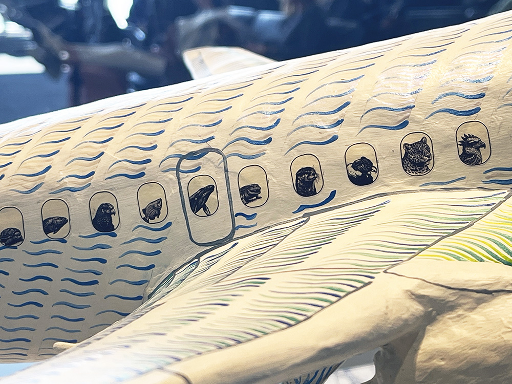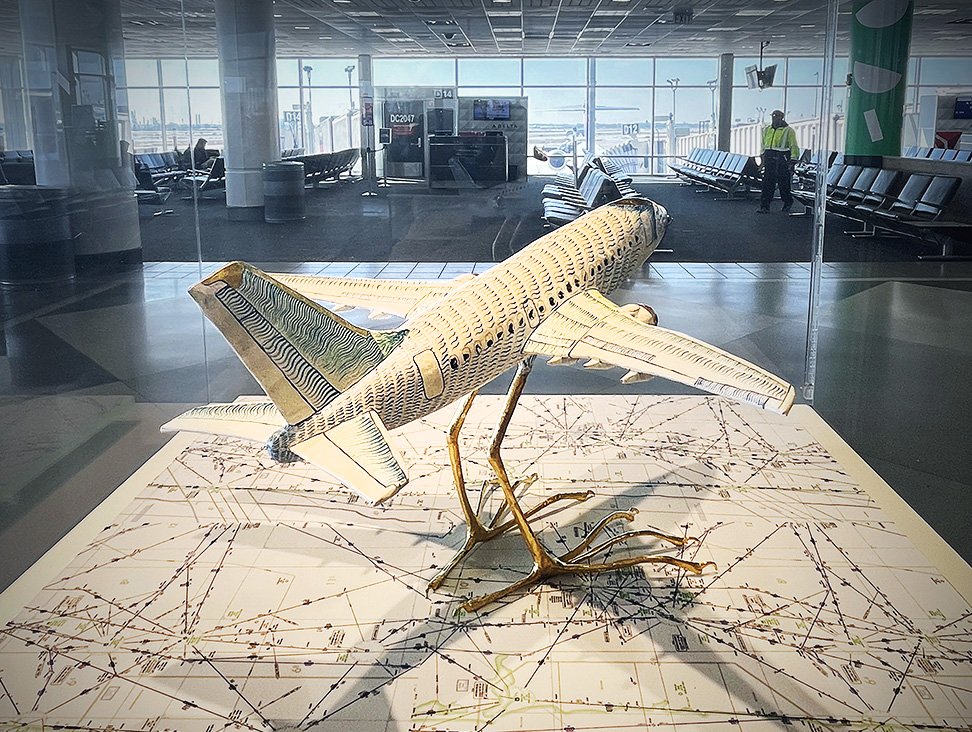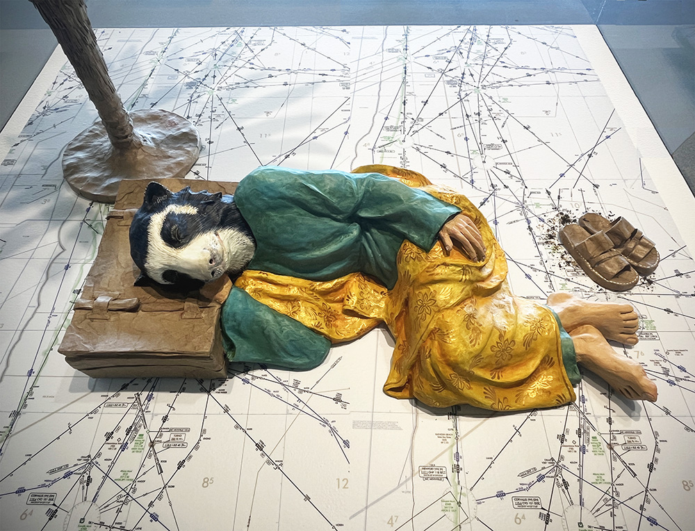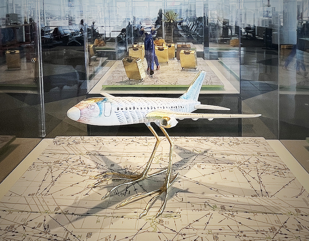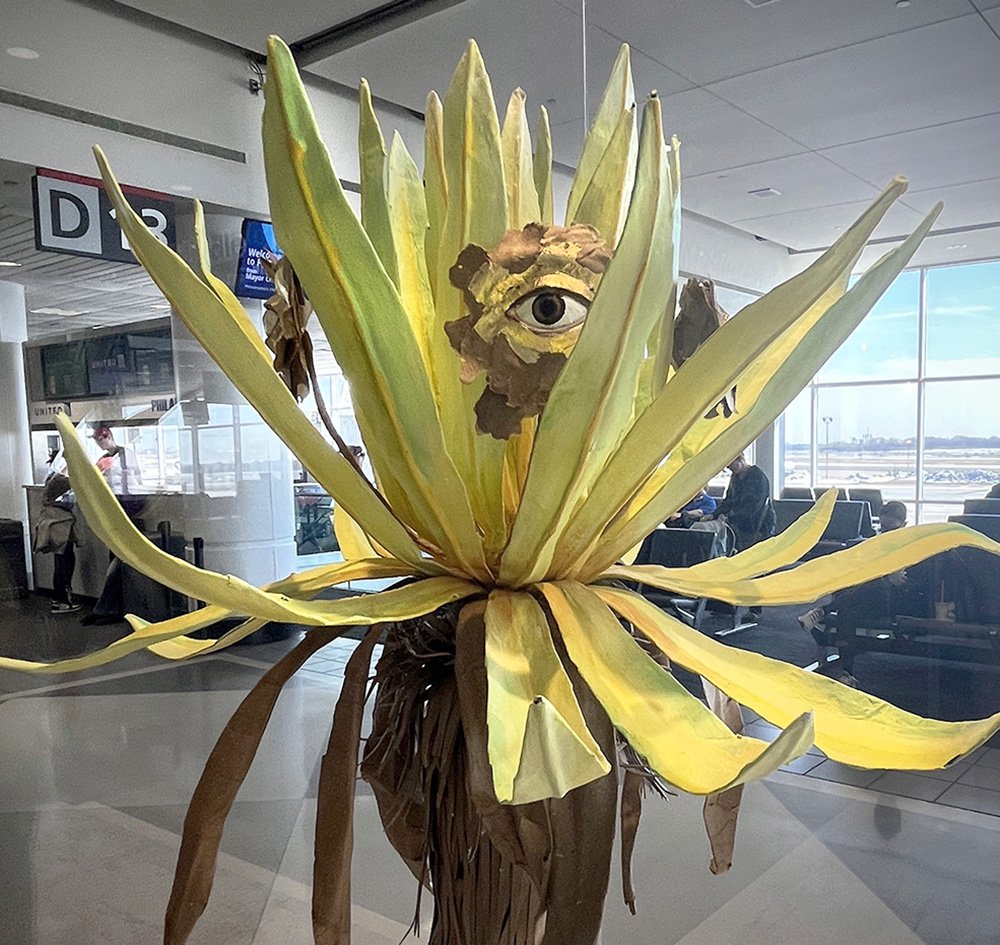 Mauricio is heavily inspired by the Mexican Surrealism movement and traditional Latin American aesthetics. Paper maché, also known as cartonería (Spanish for cardboard), is an ancient craft with the earliest recorded pieces dating back to the year 202 B.C. Like many Latin American customs, cartonería has roots in European colonialism and Catholicism. Those influences are readily seen throughout Mauricio’s work, including a puppet show inspired by the psychomagic work of Chilean filmmaker Alejandro Jodorowsky and performed at the Cali International Performance Festival. For his exhibition at Philadelphia international Airport, Mauricio created his signature paper maché figures, some at rest, some in motion, to reflect on ideas about travel and migration.