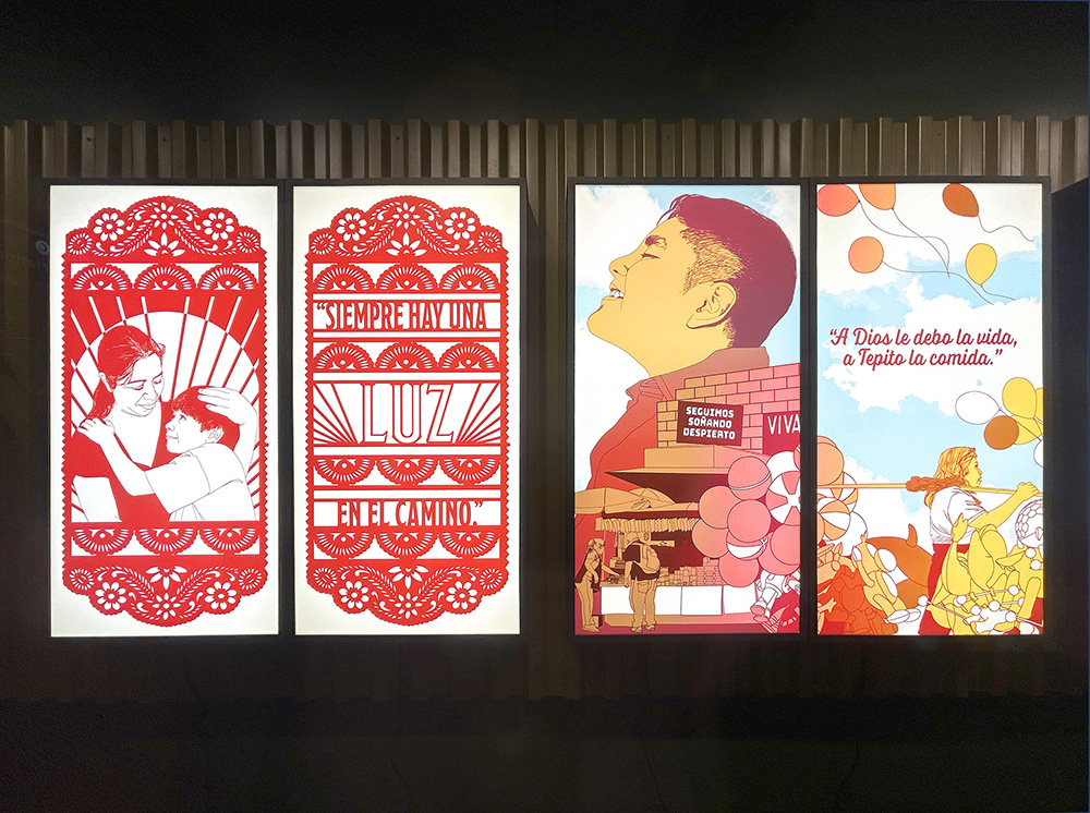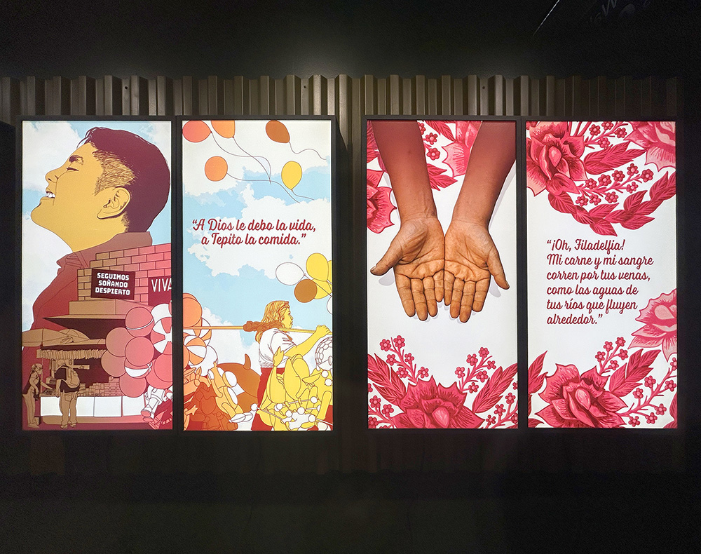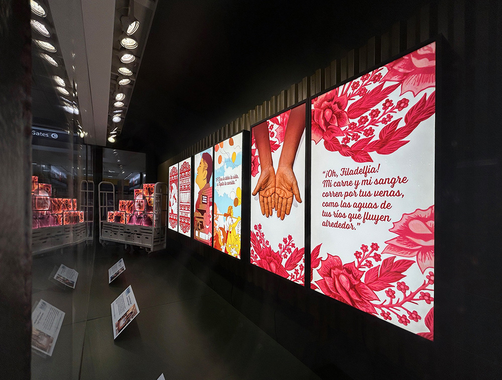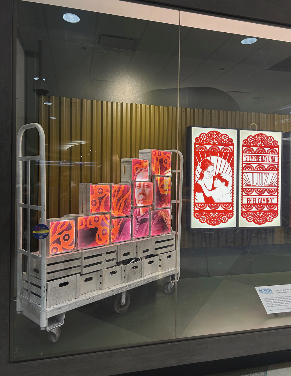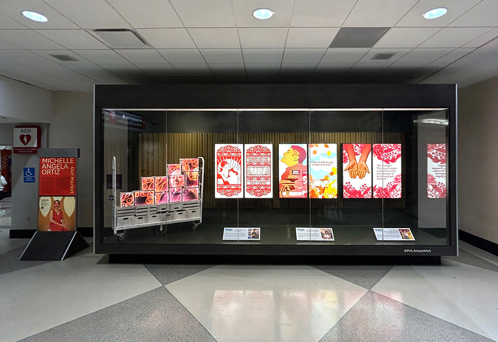 Our Market Project is rooted in the heart of Philadelphia’s 9th Street Market. Led by Michelle Angela Ortiz and Fiera Studios, it is a multi-layered, community-centered public art project that has been evolving since its inception in April 2019. Our Market focuses on celebrating and supporting the (im)migrant vendors, business owners, and neighbors who have made the area their home for generations. For her exhibition at Philadelphia International Airport, Ortiz presents an illuminated produce cart and lightbox diptychs that feature three different small businesses located in the market. Each diptych highlights stories from the business owners, centered not on labor, but on reflections of light and hope for themselves and our collective community.