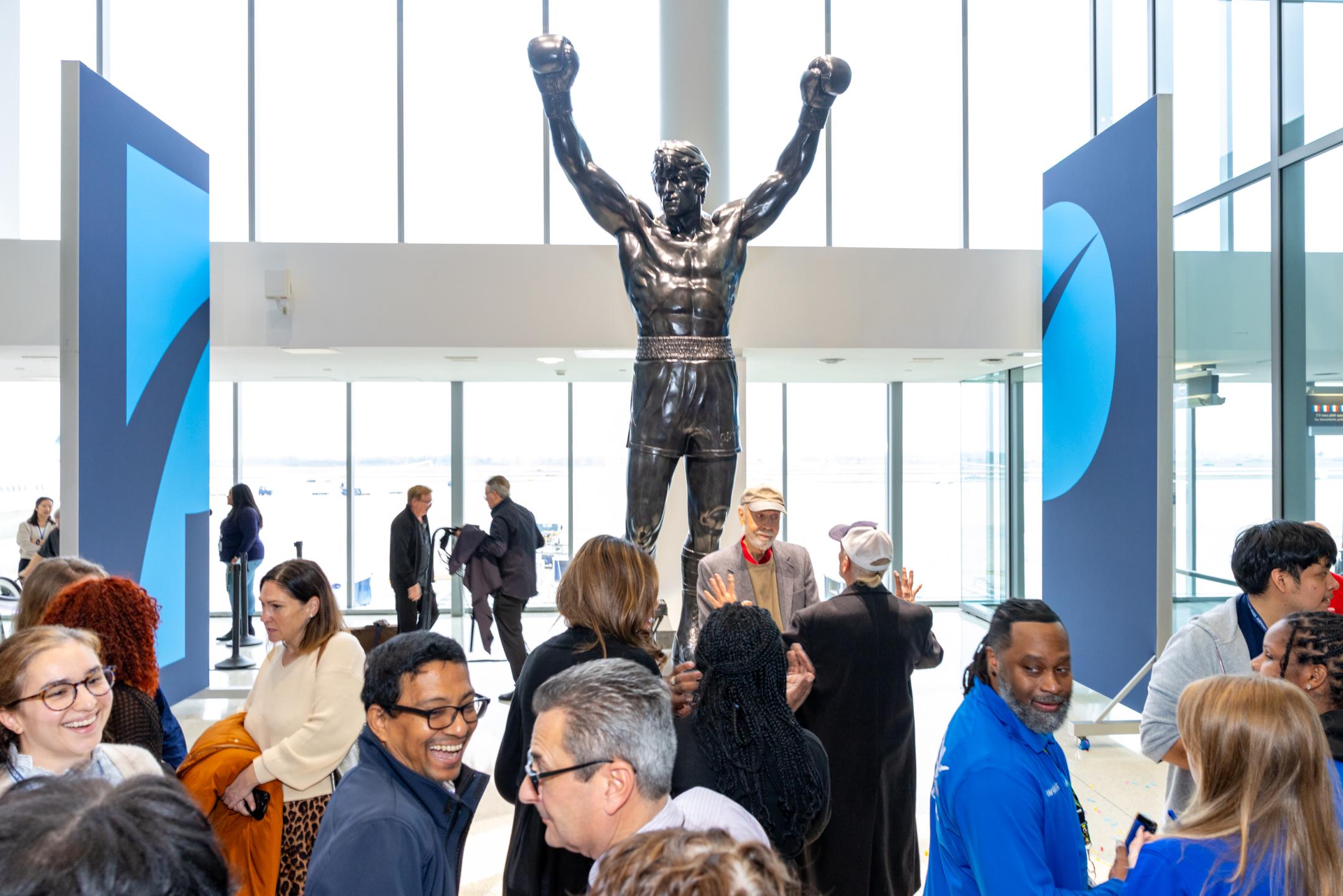 On November 21, the City of Philadelphia Department of Aviation unveiled its Rocky Balboa statue in Terminal A-West between gates A-15 and A-16. The bronze statue, one of three created by artist A. Thomas Schomberg, is 10-feet tall and sits on a three-foot-tall by four-foot black steel base. Rocky originates from the Rocky movie franchise, which chronicles the boxing journey and triumph of the fictional character Rocky Balboa. Thousands of Philadelphia tourists will now be able to visit the statue at two locations in the city, the Philadelphia Museum of Art and the Philadelphia International Airport (PHL).